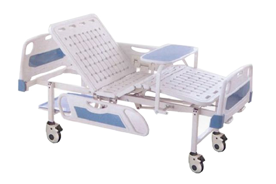 Spesifikasi : Overall size: 2220×960×500(mm), ABS bed head/foot boards, easily dismountable, Plastic bed surface; with a pair ABS side rail, 125mm dia individual breaking castors, ABS hand crank, the screw rod is equipped with two-way neutral protection device, With dinning plate, With a shelf for supporting items, Angle of back section: 0-75°±5°; Angle of leg section: 0-40°±5°